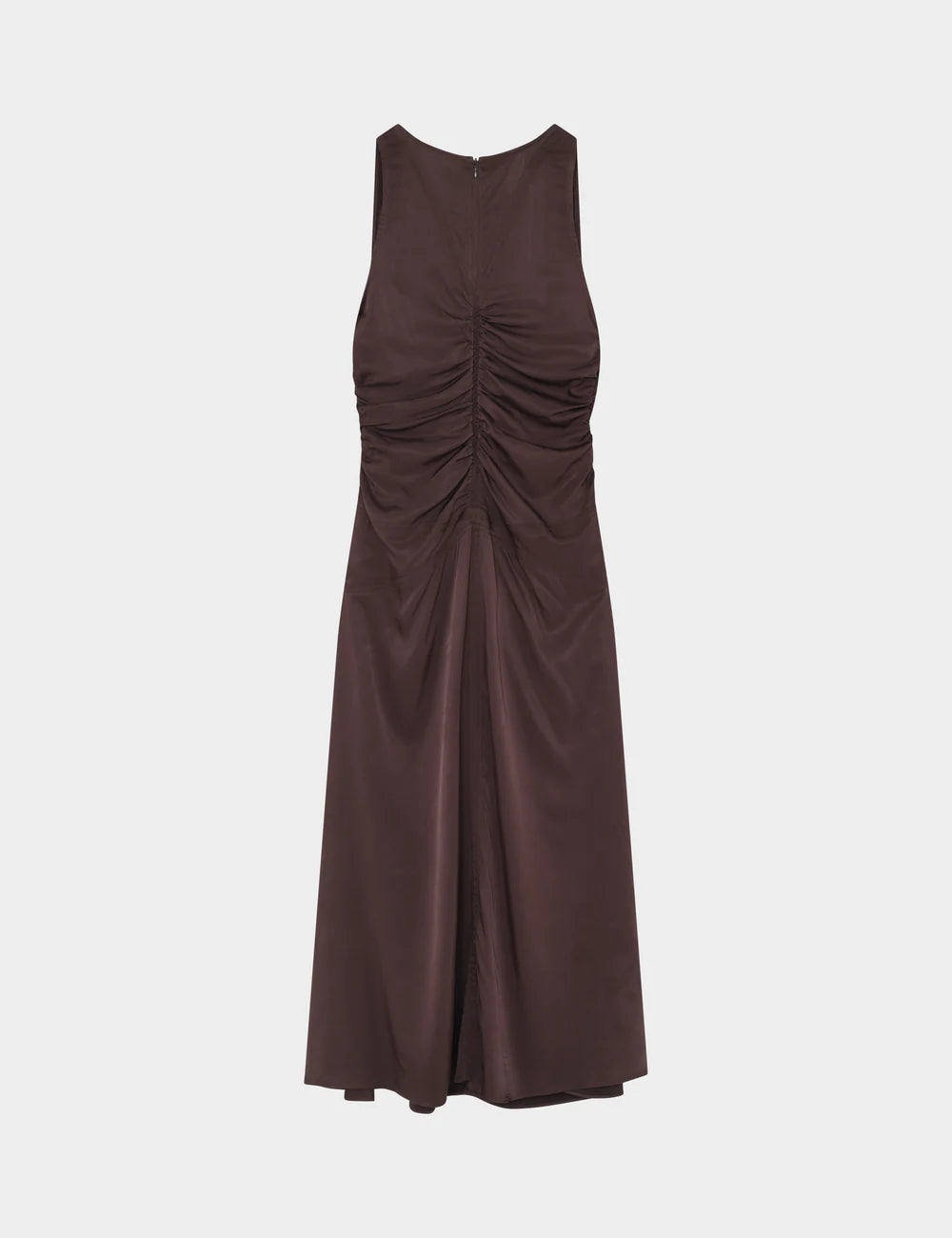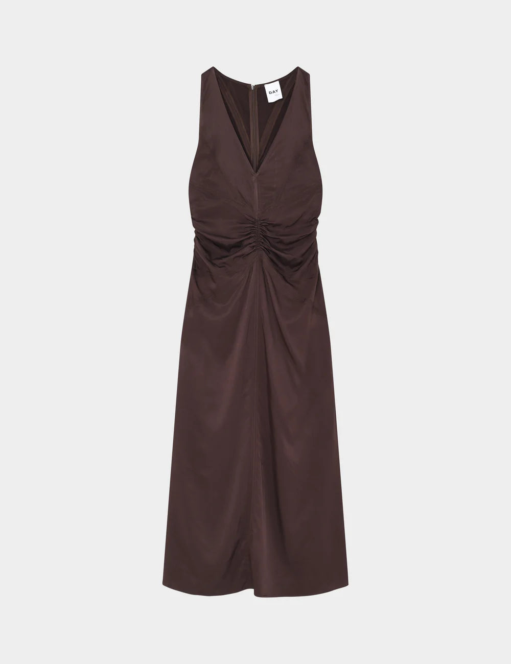 Denne ærmeløse kjole i ankellængde har et A-formet skørt, V-udskæring og lynlåslukning bagpå. Der er rynkedetaljer (ruching) i siderne og midt på kroppen, som giver en flatterende pasform. Stoffet har let stretch for komfort og bevægelsesfrihed. Kjolen har en diskret glans, som giver et let, lysende udtryk. For et mere nedtonet look kan den styles med en blazer og kitten heels.