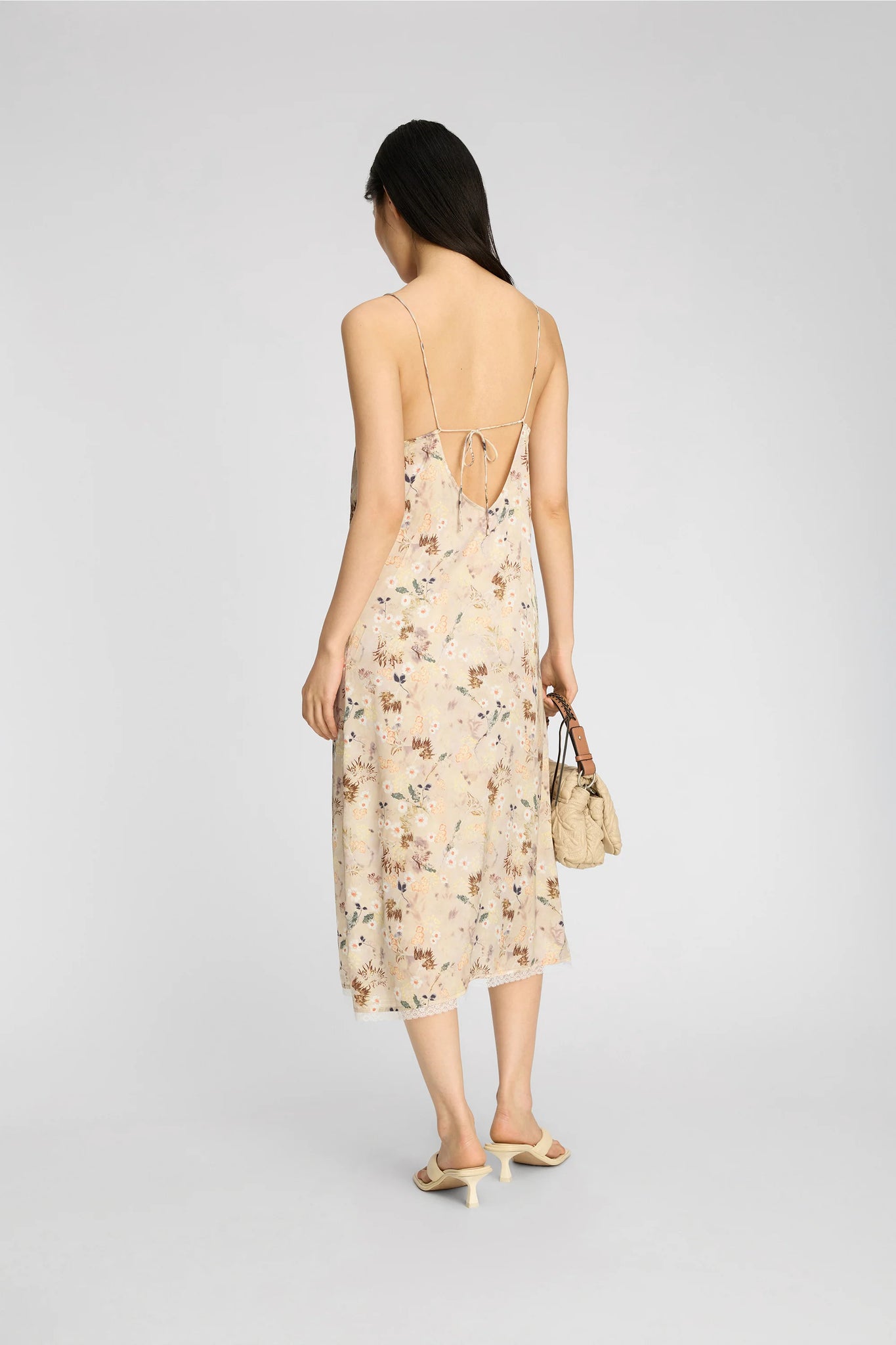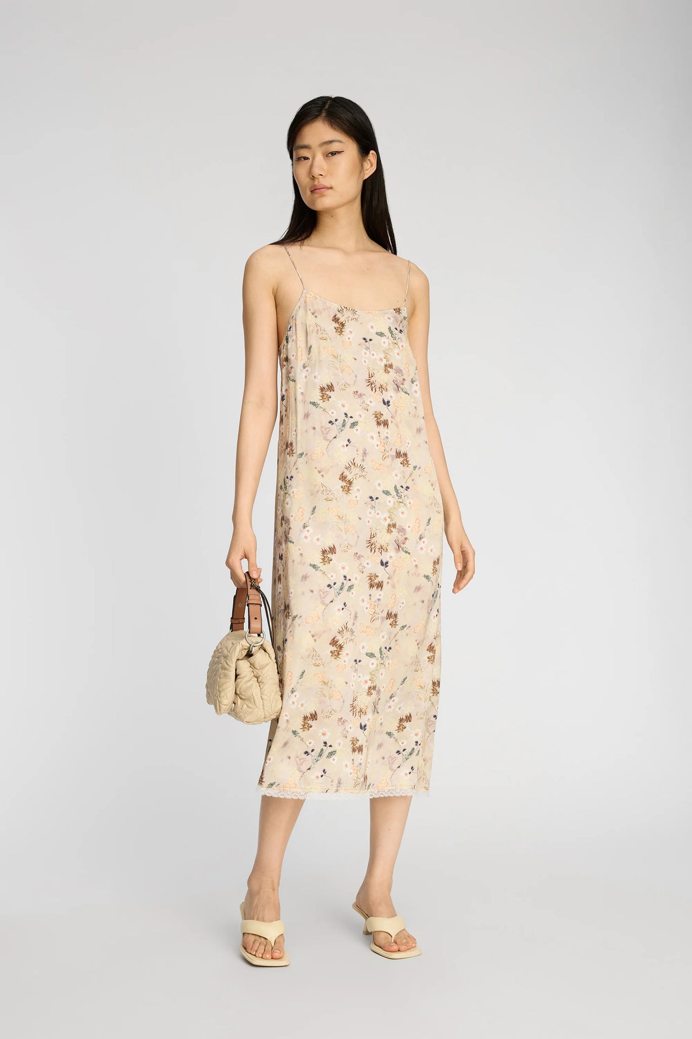 Kjole med et botanisk blomsterprint i dæmpede nuancer. Modellen har tynde stropper, en lige silhuet og let vidde mod kanten.