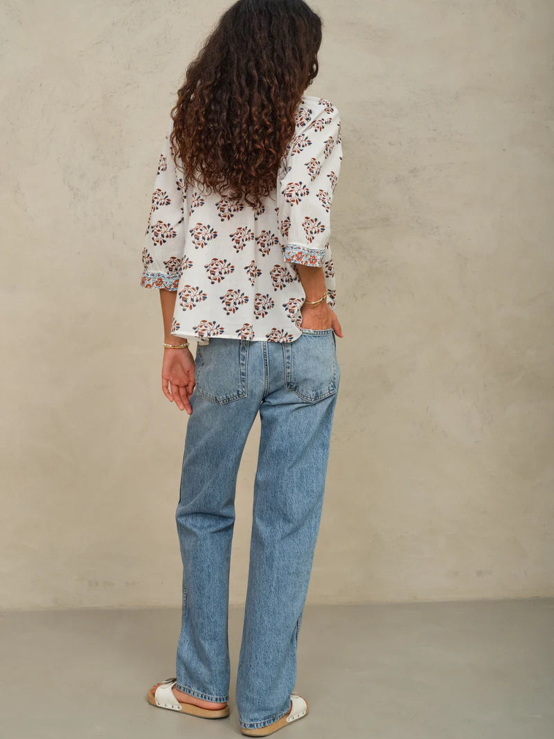 Blusen er fremstillet i en let og åndbar bomuldskvalitet, der giver et blødt og luftigt fald. Det dekorative blockprint med kontrastdetaljer tilfører dybde og et håndværksinspireret look, som gør hver style unik. M.A.B.E er kendt for netop deres fokus på print, farver og detaljer med inspiration fra bl.a. traditionelle tekstiler og håndværk