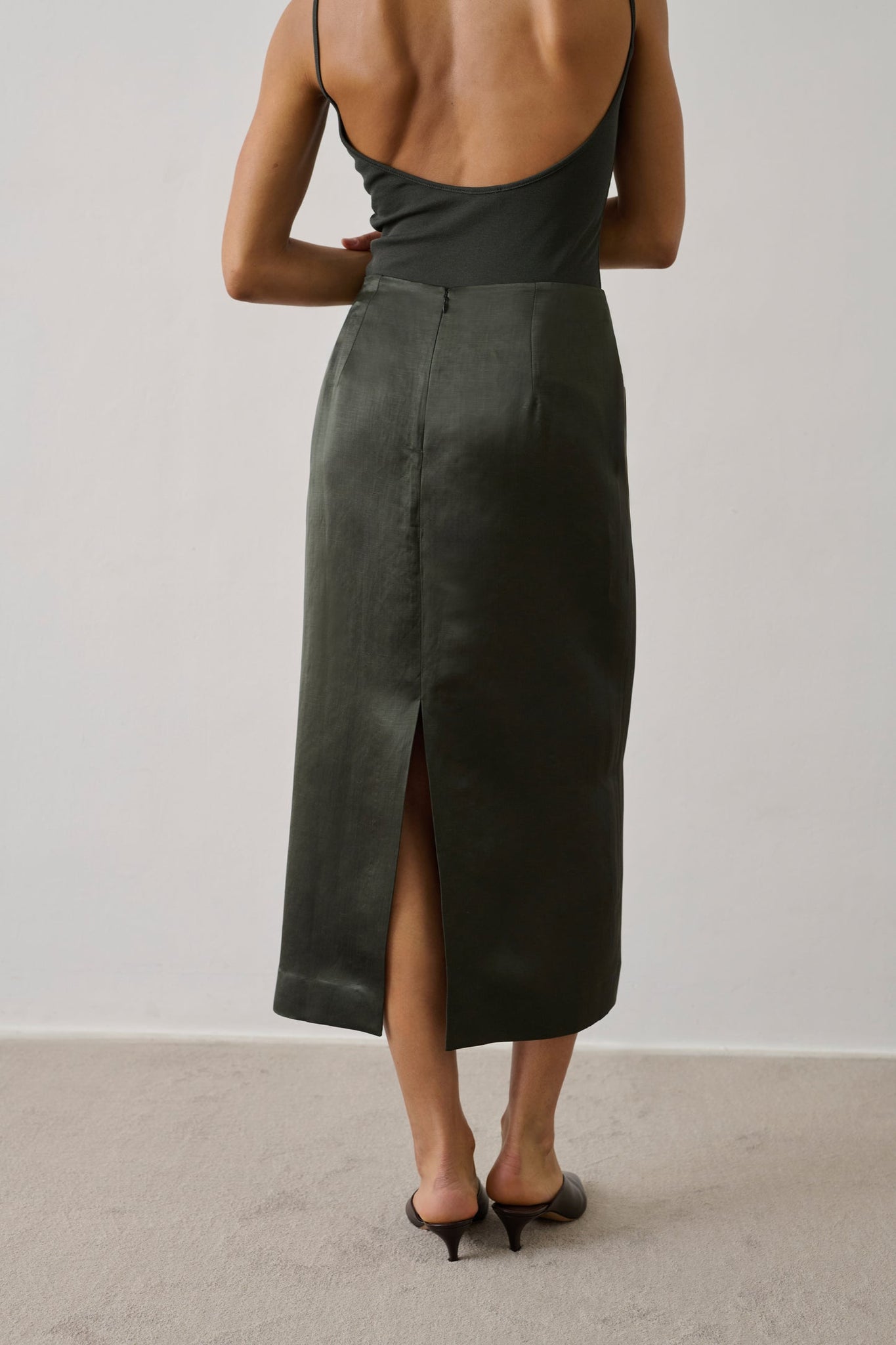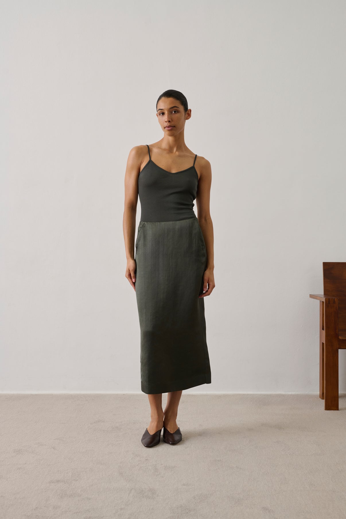 Helia er en elegant nederdel i en dyb grøn nuance (vert foncé), der kombinerer klassisk silhuet med moderne detaljer. Nederdelen har en flatterende, let A-formet pasform, som skaber bevægelse og et feminint udtryk. Materialet falder smukt og giver et sofistikeret udtryk, der fungerer lige så godt til hverdag som til mere formelle outfits.