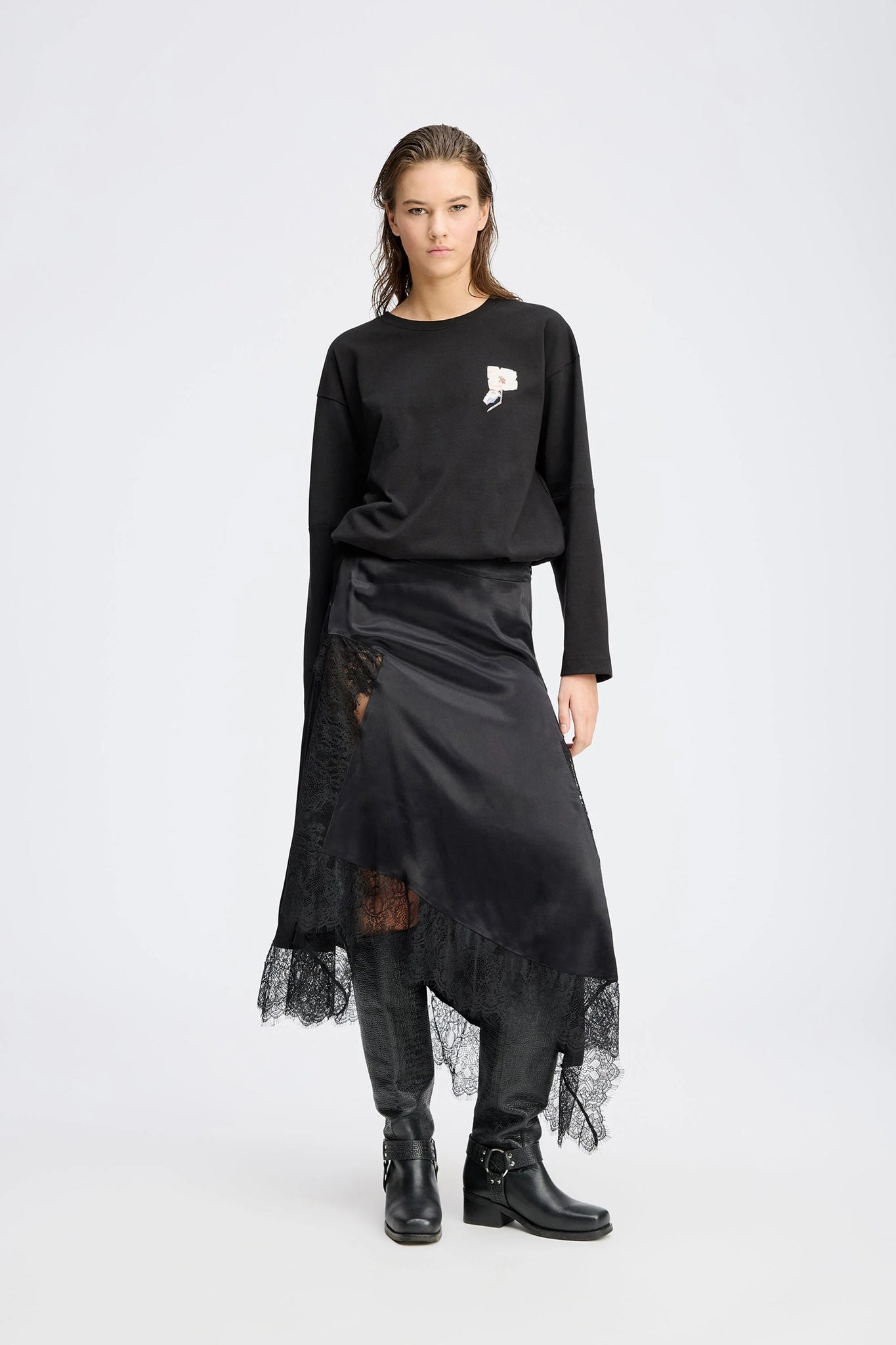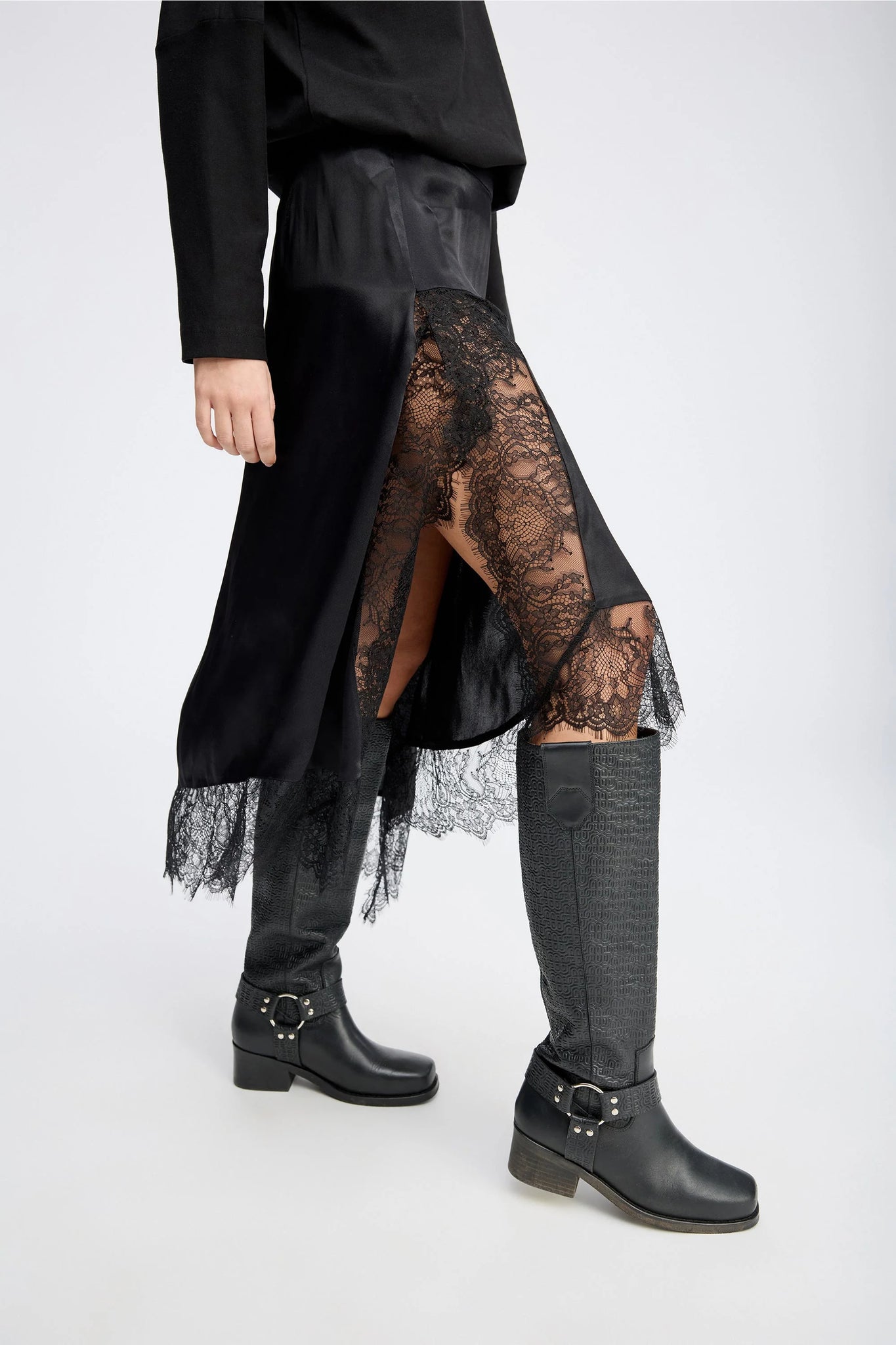 Smuk nederdel med fine blondekanter og et elegant, asymmetrisk snit. Nederdelen har en høj slids og lukkes med lynlås i siden.