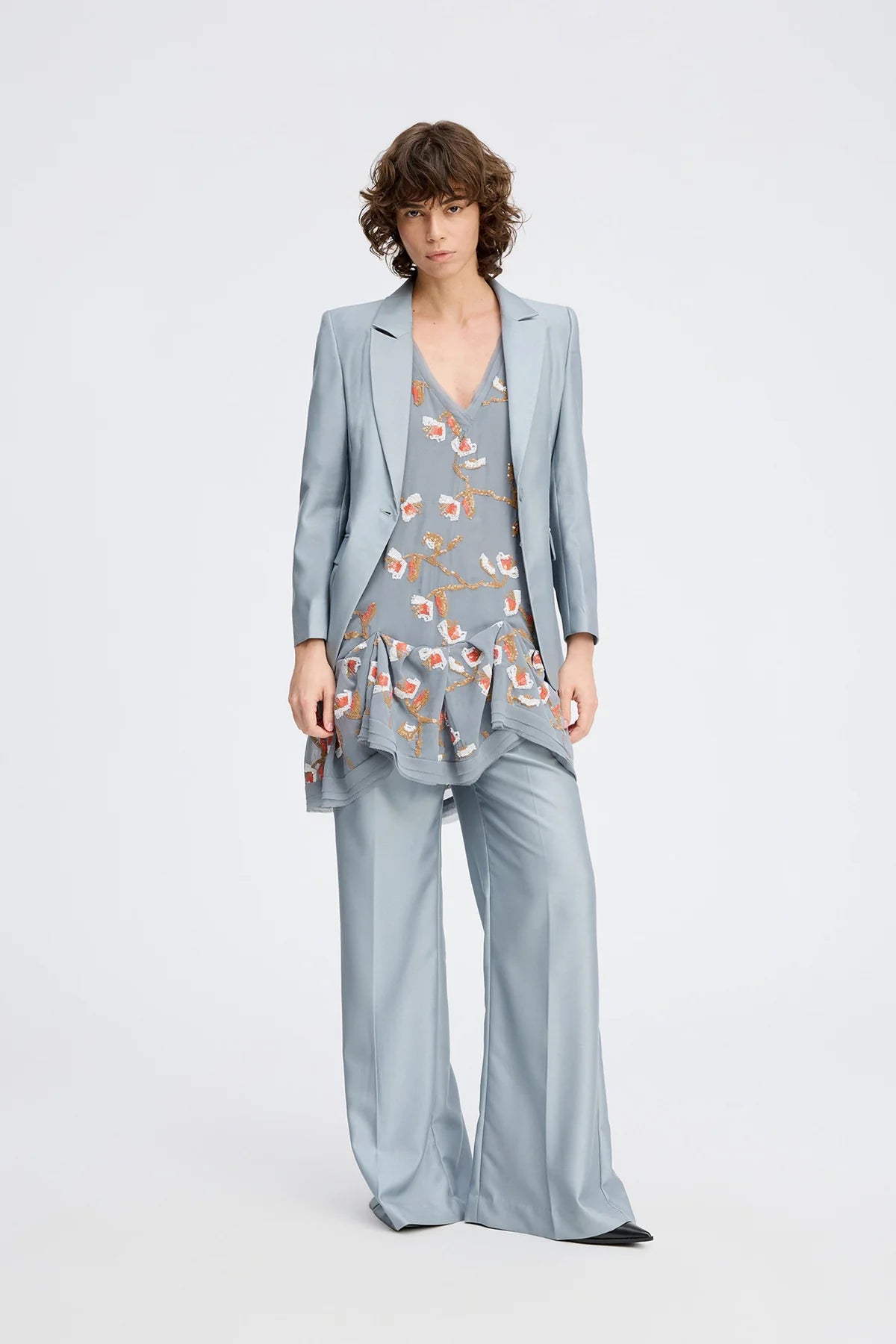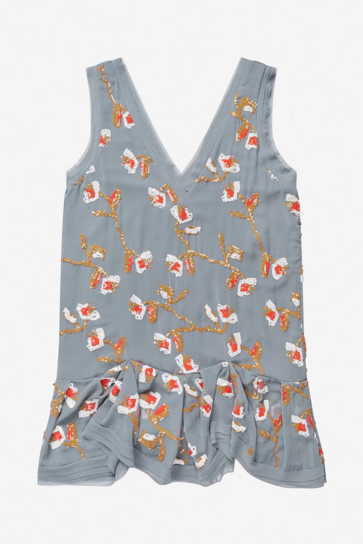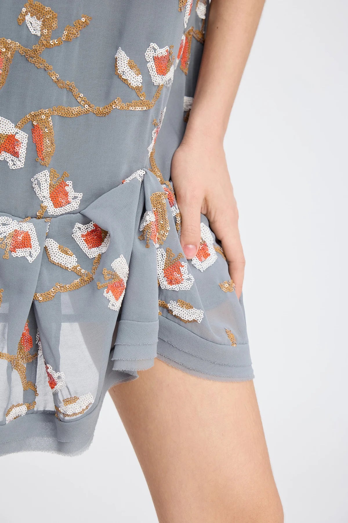 Minikjole i blød, lysgrå chiffon, pyntet med pailletter i et elegant blomstermønster. Kjolen har dyb V-udskæring, let A-formet pasform og asymmetrisk flæsekant forneden.