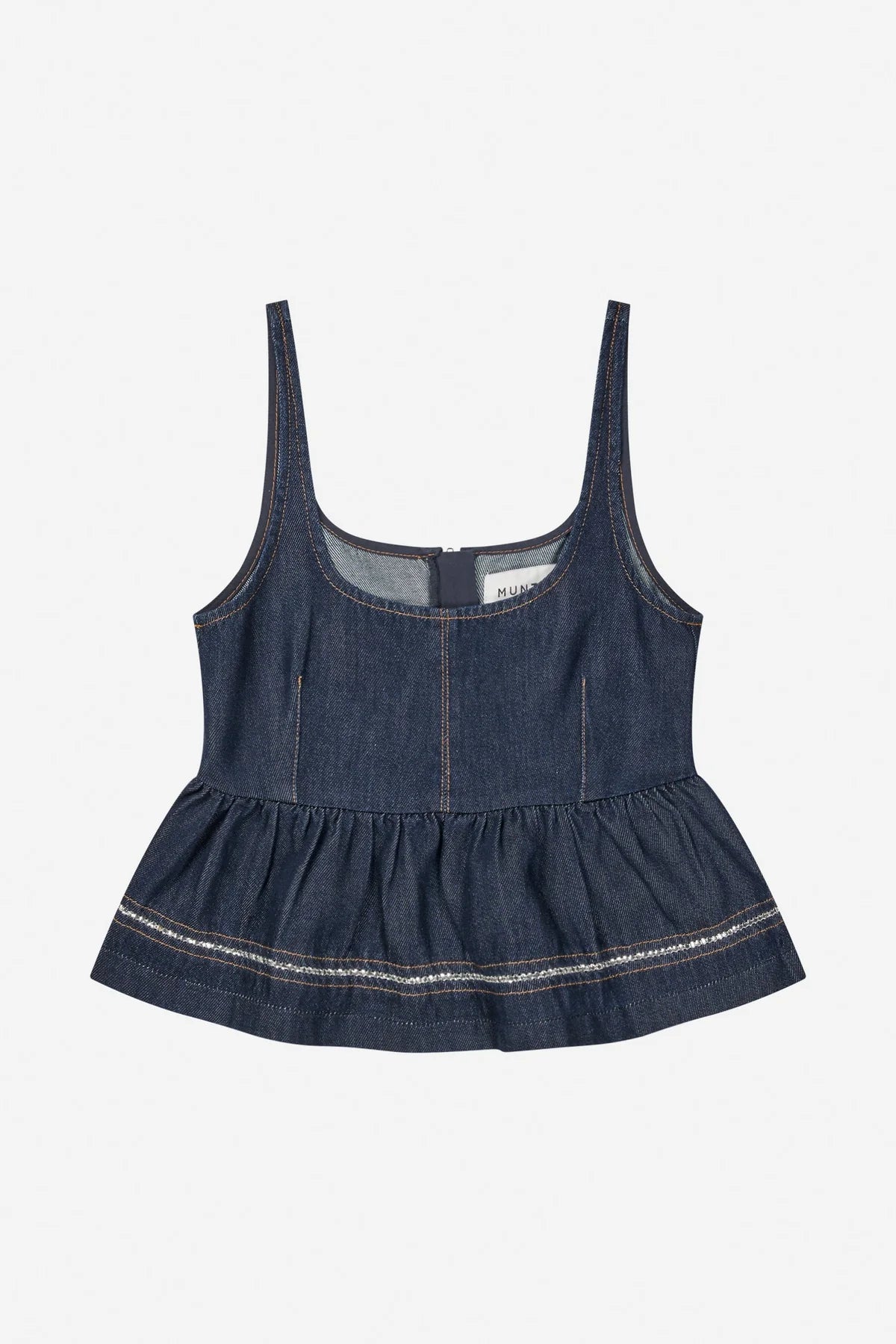 Smuk denim top med brede stropper og et elegant peplum-snit. Toppen har dekorative syninger og fine similisten-detaljer langs kanten.