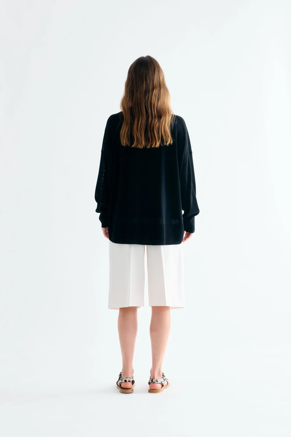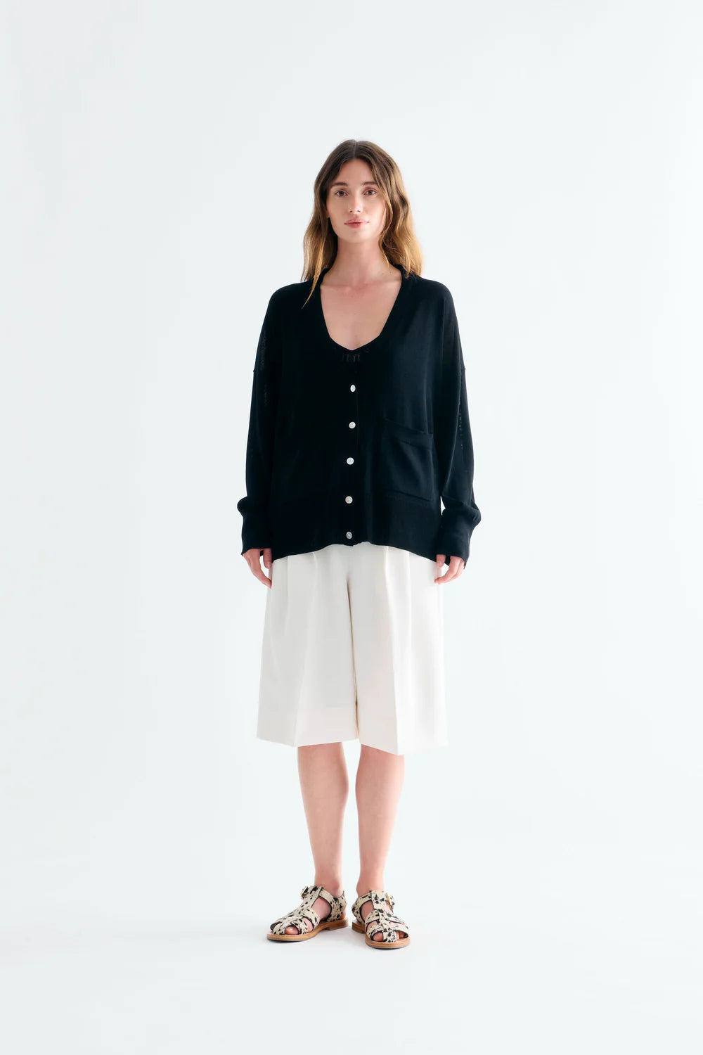 Iris Cardigan Top er en alsidig strik-cardigan med et tidløst og elegant udtryk. Designet har en åben front, lange ærmer og en blød pasform, som gør den behagelig at have på over både toppe og kjoler. Den sorte farve giver et klassisk look, der let kan styles til både hverdags- og mere polerede outfits. Brug den med jeans for et casual look eller over en kjole for et elegant lag-på-lag look.