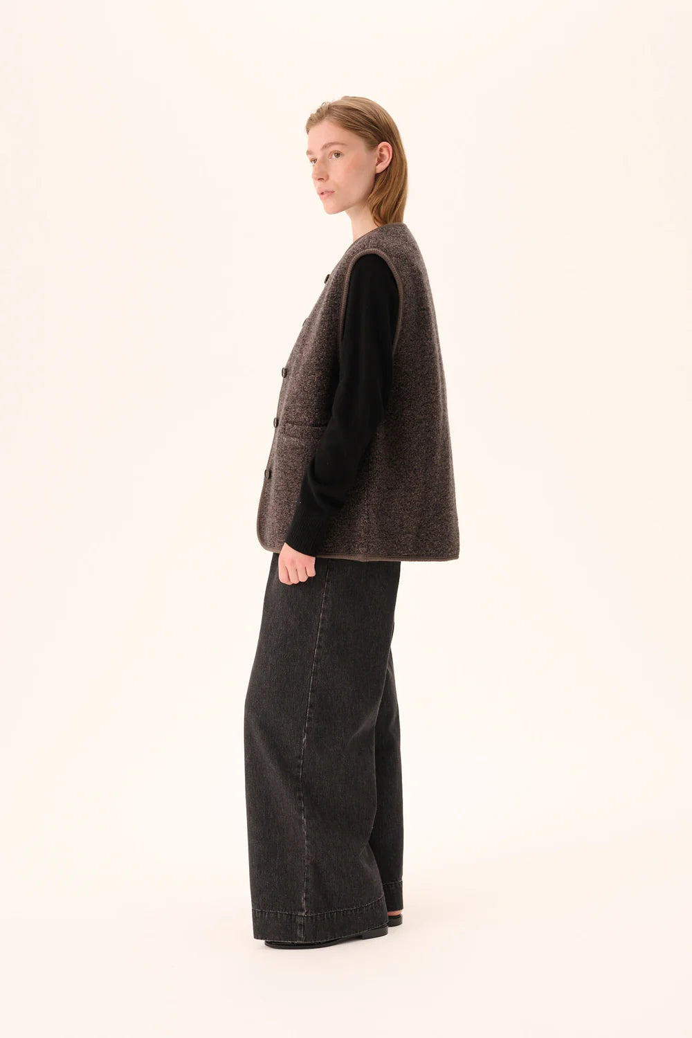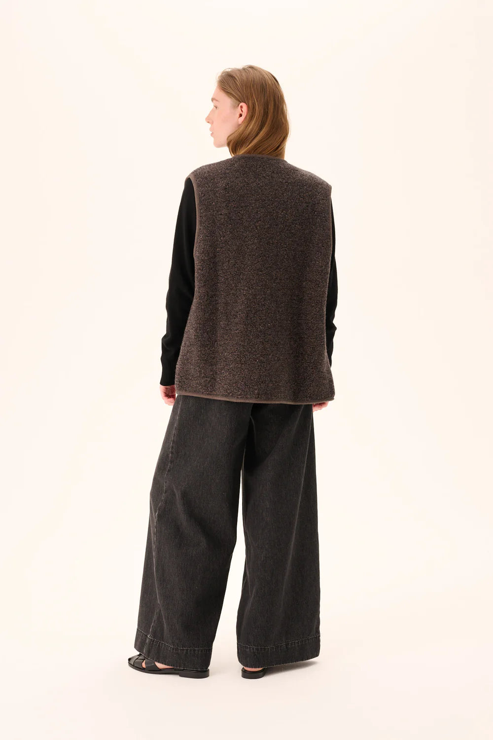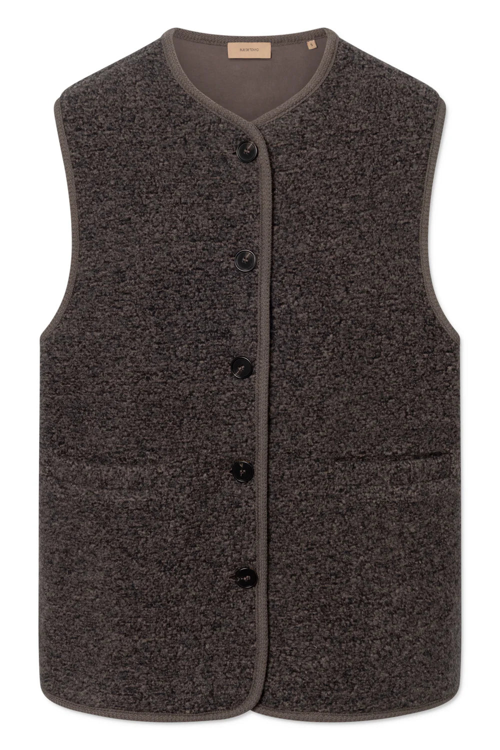 Casi er en vest i mørkegrå er designet med både komfort og stil for øje. Den runde halsudskæring og de verdensomspændende lommer foran giver et tidløst og alsidigt udtryk, der passer til enhver garderobe. De mørke hornknapper tilføjer en subtil detalje, der komplementerer den rolige grå farve. Med en afslappet pasform er denne vest ideel til hverdagsbrug eller som et lag over dit yndlingstøj. Den er fuldt foret, hvilket sikrer en behagelig følelse hele dagen.